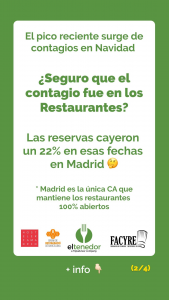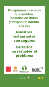 Volver a Blog COVID La hostelería, lejos de ser un foco de contagios de la Covid-19 enero 22, 2021 La hostelería ha sido uno de los sectores más afectados por la pandemia y por las restricciones sanitarias. Ahora cerrar, ahora abrir, ahora solo en determinados horarios, solo en terrazas, sin barra… Desde hace ya casi un año que la hostelería no para de ver su actividad afectada por miles de cambios en las restricciones para contener el impacto de la Covid-19 y los contagios. Sin embargo, según un estudio de ElTenedor, en colaboración con Hostelería de Madrid, el Gremi de Restauració de Barcelona y Facyre, la hostelería no es el escenario donde se han producido la mayoría de los contagios de la Covid-19. La app de reservas online de restaurantes, perteneciente a TripAdvisor, remarca como el incremento de los contagios producidos durante las fechas navideñas corresponde con un descenso importante en las reservas online de los restaurantes. Así, según datos del Ministerio de Sanidad, entre los días 4 y 10 de enero de 2021 se alcanzaron los 736,23 casos por cada 100.000 habitantes. Unos contagios que deberían haberse producido entre los días 21 de diciembre y 3 de enero. Sin embargo, durante estas mismas semanas, las reservas online en restaurantes en la Comunidad de Madrid cayeron un 22% respecto a la tendencia semanal que se iba produciendo desde noviembre de 2020, según datos de ElTenedor. “La caída de ese 22% en el negocio de la hostelería madrileña parece indicar que los madrileños redujeron sus salidas a restaurantes debido a la situación o que las reuniones se habrían trasladado al ámbito privado. Pero el análisis de los datos refleja que ese crecimiento del impacto de la COVID19 se deja notar también en aquellas zonas donde se ha limitado la actividad hostelera”, señala ElTenedor en un comunicado. Por otro lado, los datos del Ministerio de Sanidad señalan que le segmento de jóvenes entre 15 y 27 años es el que más ha crecido en contagios. Una situación que contrasta con el análisis de las reservas en la app de ElTenedor y los clientes de los restaurantes asociados a Hostelería de Madrid y el Gremi de Restauració de Barcelona, que indican que este segmento no supone más que un 10% de las reservas que se realizan en los restaurantes. ¿Los restaurantes son espacios seguros? Otro un estudio realizado por ElTenedor durante el mes de diciembre señala que el 83% de los comensales afirma sentirse seguro yendo a comer o a cenar a un restaurante y que, si las circunstancias lo permiten, lo seguirán haciendo durante este 2021 entre 1 y 2 veces por semana de media. Es más, en el mes de octubre, cuando gran parte de los restaurantes aún estaban abiertos, el Ministerio de Sanidad indicaba que sólo el 3,5% de los casos de contagio de la Covid-19 detectados se habían originado en la hostelería, cifras similares a las de otros países de nuestro entorno. Unas cifras que demuestran que la hostelería no es un gran foco de contagios de la Covid-19, y que el sector debería volver a su actividad si no queremos que vuelva a sufrir otro año tan devastador para los negocios hosteleros como el 2020.