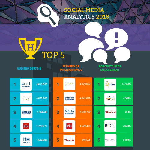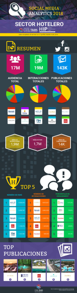 Volver a Blog Experiencia de cliente Hospitality 4.0 Hotel Trends (2019) Marketing Los grupos hoteleros más influyentes en redes sociales durante el 2018 enero 28, 2019 Los grupos hoteleros más conocidos han visto en las redes sociales una herramienta con la que alcanzar sus objetivos de marketing y mejorar la relación con sus clientes. Para el sector hotelero las redes sociales se han convertido en un mecanismo perfecto para conocer de primera mano la experiencia del usuario; además de compartir directamente con sus clientes y potenciales clientes, ofertas y promociones. Hemos realizado un estudio para conocer cuáles han sido los grupos hoteleros más influyentes en redes sociales del 2018 en colaboración con Cool Tabs. En esta ocasión hemos analizado todos los perfiles sociales de los principales grupos hoteleros. ¿Quieres saber quiénes se sitúan en el top de este ranking? ¡Sigue leyendo! Grupos hoteleros más influyentes en RR.SS. El 2018 arroja nuevos datos sobre cuáles son las cadenas hoteleras más influyentes en las principales redes sociales. Tanto en Facebook como en Twitter e Instagram los grupos hoteleros Palladium, Barceló y Meliá se reparten el top 3. Son estos grupos hoteleros los que cuentan con comunidades e índices de engagement mayores. En conjunto, estos grupos hoteleros aúnan una gran cantidad de seguidores en las principales redes sociales. Así encontramos que Meliá Hotels International, Grupo Palladium y Barceló Group Hotel acumulan en Facebook e Instagram más de 8 millones y medio de followers respectivamente. Mientras que en Twitter los tres primeros puestos del ranking los ocupan los grupos Palladium, Barceló y Riu. Juntos acumulan más de 600.000 followers. No se puede discutir la buena acogida que tienen los contenidos ofrecidos por los principales grupos hoteleros. Es un sector muy agradecido en cuanto a redes sociales se refiere ya que los usuarios están más que dispuestos a compartir cómo han ido sus ansiadas vacaciones. Pero también es un canal muy utilizado por los usuarios para conocer ofertas y promociones, así como para comparar opiniones. Seguidores, interacciones y engagement de los principales grupos hoteleros Hemos analizado los perfiles sociales de los principales grupos hoteleros en cada una de las principales redes sociales. En total analizamos más de 40 grupos hoteleros y sus respectivos perfiles sociales. El top 3 de Facebook, en cuanto a los perfiles con mayor número de seguidores, ha estado liderado en 2018 por el grupo Meliá con 3 millones de fans, seguido de Palladium, con casi 3 millones; y el grupo de hoteles Barceló con algo más de 2 millones de fans. Estas 3 cadenas acumulan más de 5,9 millones en interacciones. Unos datos que se traducen en una tasa de engagement del 144% para Barceló Hotel Group, 68% para el Meliá Hotels Group y 20% para el Grupo Palladium. En el caso de Instagram el top 3 del ranking está liderado por el grupo Palladium cuyos perfiles superan los 8 millones de seguidores, con mucha diferencia respecto a sus competidores. El segundo y tercer puesto pertenecen al grupo hotelero Meliá con 3,7 millones, y Barceló con 3,1 millones de seguidores, respectivamente. En este caso, es el grupo Palladium quien acumula más interacciones superando los 4 millones. Instagram es una de las redes sociales que más favorecen las interacción entre usuarios. Por eso no es de extrañar que la tasa de engagement del grupo Palladium, Barceló y Meliá alcance porcentajes del 608%, 506% y 313%, respectivamente. La red social del pajarito, Twitter, muestra unos datos más ajustados. Así encontramos que los primeros puestos, en cuanto a número de seguidores, están liderados por Palladium con más de 260.000, Barceló con poco más de 158.000, y el grupo Riu, cuyos perfiles suman 47.000 fans. Es cierto que Twitter, en la actualidad, es una red social que ha perdido adeptos a favor de otras como Instagram, pero sí suele utilizarse como canal de atención al usuario, también en el caso del sector turístico. En materia de interacciones cabe destacar Paradores. Este año se cuela en el ranking liderando las interacciones en Twitter con 45.588. Le siguen Palladium y Melia con más de 25.000 y 23.000 interacciones respectivamente. Las publicaciones que triunfan en redes sociales en el sector hotelero La red social de las fotos ofrece la oportunidad perfecta para los grupos hoteleros de estrechar lazos y gamificar su comunidad. Si perteneces al sector hotelero, no dudes en seguir el ejemplo de las cadenas hoteleras más punteras para triunfar con tu estrategia de Social Media. En esta ocasión el ranking de cadenas con las publicaciones más populares del 2018 lo encabeza el grupo Palladium. En concreto, la marca Ushuaia Ibiza acumuló en una única publicación más de 25,9 mill likes. Cabe destacar que la tercera publicación con más likes es un sorteo puesto en marcha por Riu Hotels. La promoción consistía en una sencilla mecánica en la que por seguir a @RiuHotels, mencionar en la publicación y hacer un regram podías ganar 5 noches en el Riu Palace Punta Cana. ¡Un dato curioso! Las publicaciones que más comentarios registraron en Instagram se refieren a sorteos. La puesta en marcha de campañas, más o menos sencillas, es una herramienta perfecta para gamificar y diversificar tus perfiles sociales, así como una gran herramienta de captación de leads. En cuanto a Facebook, las publicaciones con mayor número de likes corresponden a los grupos Meliá, IberoStar y Riu. Aunque la diferencia de likes no es demasiado pronunciada, cabe destacar que las 3 publicaciones son de una temática parecida. En estas publicaciones se llama a la atención del usuario y se facilita el link para que hagan la reserva de sus próximas vacaciones. Como ocurre con Instagram, en Facebook las publicaciones con más comentarios son aquellas referidas a concursos y sorteos. Conclusiones del ránking de cadenas hoteleras E