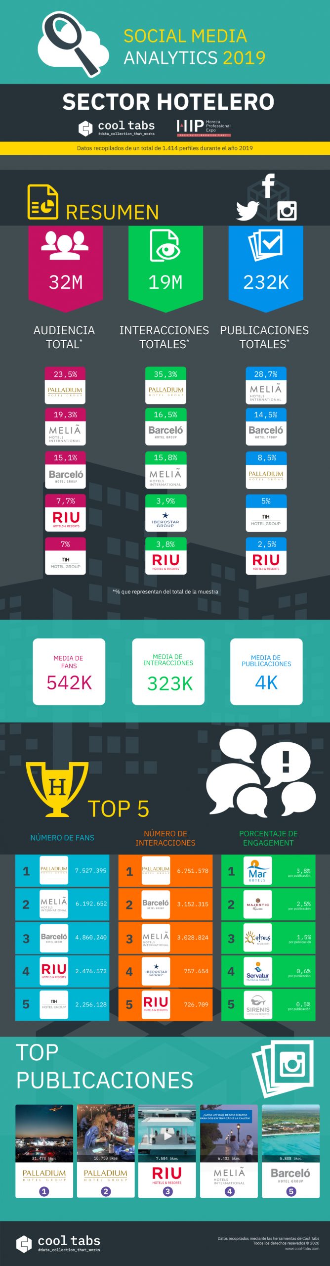 Volver a Blog Marketing Ranking de cadenas hoteleras más activas en Social Media enero 23, 2020 El sector hotelero español aumenta su audiencia en redes sociales, pero pierde engagement en 2019 ● Los grupos hoteleros suman 32 millones de seguidores en Facebook, Instagram y Twitter ● Palladium, Meliá y Barceló lideran el ránking de las cadenas más influyentes ● Instagram, la red social en la que más crece: un 86,29% respecto a 2018 Cool Tabs y Hospitality Innovation Planet (HIP) han realizado su estudio anual sobre la influencia en redes sociales de las cadenas hoteleras españolas más relevantes en 2019. Para el análisis, realizado en Facebook, Instagram y Twitter, se han monitorizado un total de 1.414 perfiles de más de 50 cadenas hoteleras españolas, entre las que se encuentran AC Hotels, Barceló Hotel Group, Iberostar Hotels & Resorts, Meliá Hotels International, NH Hotel Group, Palladium Hotel Group y RIU Hotels & Resorts. Los hoteles españoles reúnen cerca de 32 millones de fans En conjunto, los grupos hoteleros analizados concentran una audiencia de casi 32 millones de followers (más de 25 millones en Facebook, 5 millones en Instagram y 1,7 millones en Twitter), lo que supone un aumento de 10 millones de seguidores respecto al año pasado. A pesar de esta destacada cifra y de la notable actividad que presentan en sus perfiles (con un total de 232.786 publicaciones) desciende el número de interacciones que realizan los usuarios: 19 millones de interacciones producidas en 2019, frente a las casi 24 millones del periodo anterior. Estos datos se traducen en una media por grupo hotelero de 323.000 interacciones anuales y un 0,22% de engagement por publicación. Palladium, la cadena hotelera con más seguidores e interacciones Palladium lidera el ránking de seguidores, con más de 7,5 millones de fans en las tres redes sociales. La cadena escala desde el segundo puesto, que consiguió en 2018, y le arrebata el liderazgo a Meliá, pese a sus más de 6 millones de seguidores. Les siguen en esta clasificación Barceló, con 4,8 millones; RIU, con cerca de 2,5 millones y NH, con más de 2,2 millones. Aunque Palladium se sitúa a la cabeza en seguidores de Facebook (5,7 millones) e Instagram (1,5 millones), Meliá le supera en Twitter (298.000 frente a 266.000). Además, por tercer año consecutivo, Palladium se posiciona como la cadena española que más interacciones ha conseguido, con 6,7 millones. Completan el top 5 de este ránking Barceló, con 3,1 millones; Meliá, con 3 millones e Iberostar y RIU, con más de 757.000 y 726.000, respectivamente. En cuanto a la clasificación de grupos hoteleros con mayor engagement , Mar Hotels se sitúa como la cadena que mayor compromiso consigue de sus seguidores, con un 3,8% por publicación. A esta le siguen Majestic Resorts, con un 2,5% y Ohtels, con un 1,5%. Las publicaciones de Palladium, las más exitosas en Instagram Aunque Facebook es la plataforma en la que más usuarios reúnen, el estudio pone de manifiesto cómo, en el sector turístico, las redes sociales se encuentran aún en una etapa de crecimiento, especialmente en Instagram, donde estos grupos han experimentado un crecimiento del 86,29% respecto a 2018. La red social de la fotografía por excelencia se ha convertido en un referente para hoteles y usuarios. En 2019, el ránking de grupos hoteleros con las publicaciones más populares en Instagram vuelve a liderarlo Palladium, que consiguió un total de 5,6 millones de likes . También es suya la publicación más exitosa, con 31.400 likes . La segunda plaza es para Barceló, con 2,1 millones de likes , y la tercera la ocupa Meliá, con más de 2 millones de likes. Conclusiones del estudio: El sector hotelero en redes sociales sigue teniendo margen de crecimiento, especialmente en Instagram y en Facebook. Facebook es la red social con mayor comunidad e Instagram la que más crece. Las cadenas deben focalizarse en fortalecer el compromiso y la fidelidad de sus seguidores. A pesar del aumento de la audiencia y de las publicaciones realizadas, han visto cómo, en 2019, han caído el número de interacciones, así como el compromiso de los usuarios. El grupo Palladium es la cadena española más influyente en redes sociales, seguido de Meliá, Barceló, RIU, NH e Iberostar. El sector hotelero español aumenta su audiencia en redes sociales, pero pierde engagement en 2019 ● Los grupos hoteleros suman 32 millones de seguidores en Facebook, Instagram y Twitter ● Palladium, Meliá y Barceló lideran el ránking de las cadenas más influyentes ● Instagram, la red social en la que más crece: un 86,29% respecto a 2018 Cool Tabs y Hospitality Innovation Planet (HIP) han realizado su estudio anual sobre la influencia en redes sociales de las cadenas hoteleras españolas más relevantes en 2019. Para el análisis, realizado en Facebook, Instagram y Twitter, se han monitorizado un total de 1.414 perfiles de más de 50 cadenas hoteleras españolas, entre las que se encuentran AC Hotels, Barceló Hotel Group, Iberostar Hotels & Resorts, Meliá Hotels International, NH Hotel Group, Palladium Hotel Group y RIU Hotels & Resorts. Los hoteles españoles reúnen cerca de 32 millones de fans En conjunto, los grupos hoteleros analizados concentran una audiencia de casi 32 millones de followers (más de 25 millones en Facebook, 5 millones en Instagram y 1,7 millones en Twitter), lo que supone un aumento de 10 millones de seguidores respecto al año pasado. A pesar de esta destacada cifra y de la notable actividad que presentan en sus perfiles (con un total de 232.786 publicaciones) desciende el número de interacciones que realizan los usuarios: 19 millones de interacciones producidas en 2019, frente a las casi 24 millones del periodo anterior. Estos datos se traducen en una media por grupo hotelero de 323.000 interacciones anuales y un 0,22% de engagement por publicación. Palladium, la cadena hotelera con más seguidores e int