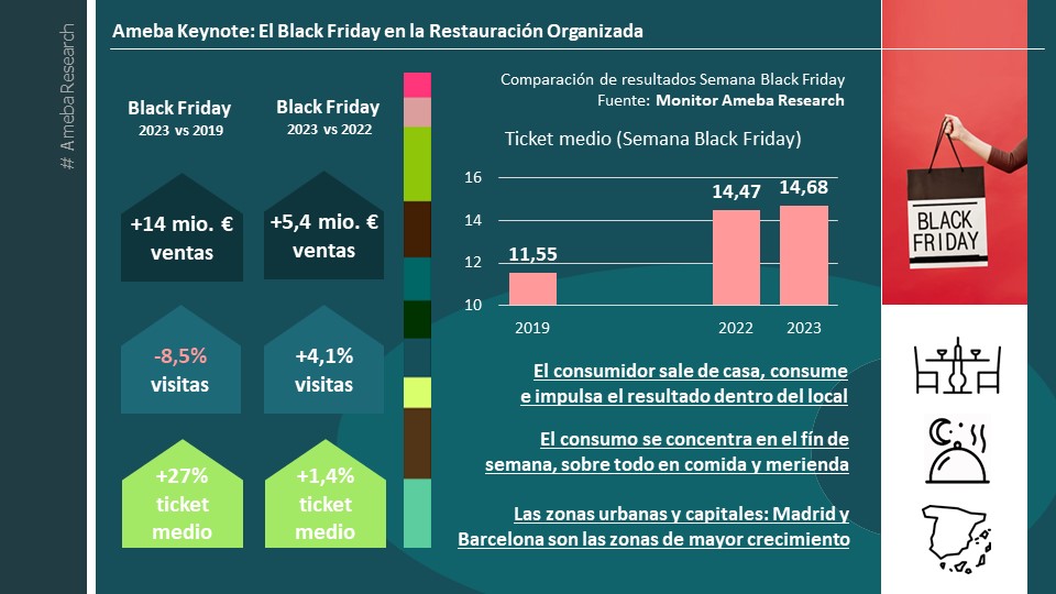 Volver a Blog TendenciasHoreca El incremento de ventas en Black Friday anticipa una buena Navidad para la hostelería diciembre 4, 2023 Llega diciembre y esto significa que la hostelería se prepara para un final de año marcado por la temporada navideña. Cenas de empresa, comidas, y celebraciones van a ser la tónica habitual de las próximas semanas, por lo que los hosteleros auguran un impulso en la actividad económica y un buen ritmo en cuanto al número de reservas. En este sentido, para anticipar lo que está por venir de cara a la época fuerte de la actual campaña de Navidad, el sector ha analizado las cifras cosechadas por la hostelería durante la semana del Black Friday (20 al 26 de noviembre de 2023) y todo presagia un panorama prometedor, de acuerdo con los datos de Ameba Research sobre las principales cadenas del mercado español en los segmentos de Quick Service Restaurant, Casual Dining y Café. Crecimiento del +5,6%: Una Inyección de Vitalidad en el Sector Los números hablan por sí mismos: las ventas totales han experimentado un saludable crecimiento del +5,6% en comparación con la misma semana del año pasado. Esto se traduce en un incremento de 5,4 millones de euros, pintando un cuadro optimista para la hostelería en las próximas semanas hasta la celebración de Reyes en 2024. Las Compras Provocan más Consumo Hostelero ¿Qué impulsa este alentador desempeño? A pesar del auge de las ventas en línea, el comportamiento de los consumidores durante la semana del Black Friday ha estado marcado por salidas para compras y un aumento en el consumo comercial, dentro del local. En detalle, los clientes han gastado un poco más en sus pedidos, por lo que el valor del ticket medio ha experimentado un incremento del 1,4% en comparación con 2022. Más significativamente, si se coteja con las cifras prepandemia de 2019, el ticket medio ha experimentado un notable crecimiento del 27%. Este fenómeno sugiere una recuperación continua del poder adquisitivo del consumidor en la hostelería. Fin de Semana y Preferencia por Comida y Merienda Los datos de Ameba Research revelan que el consumo se concentra principalmente en el fin de semana, con especial énfasis en la comida y la merienda. Esta inclinación sugiere una oportunidad estratégica para los negocios de hostelería de adaptar sus ofertas y promociones para atraer a los clientes durante estos momentos clave. Madrid y Barcelona Lideran el Crecimiento En términos de crecimiento, Madrid y Barcelona destacan como las zonas líderes. Estas ciudades se erigen como centros de actividad hostelera, contribuyendo de manera significativa al aumento general de las ventas y reforzando su posición como destinos clave para los amantes de la gastronomía y la hostelería. ¿Qué depara la temporada de Navidad 2023 a la hostelería? Las cifras ofrecidas hablan alto y claro: la hostelería española se prepara para una campaña navideña aún más grande que la del año pasado. Aunque con crecimientos más comedidos, la industria espera que la Navidad sea el motor que dinamice la actividad en un momento en el que destaca un contexto socioeconómico inestable a causa de la inflación. Por lo tanto, el Horeca tiene que estar listo para recibir a sus comensales en esta época tan característica sin perder de vista la gestión del establecimiento, incluyendo los procesos y equipos, las tendencias gastronómicas que reclama la demanda actual, o las tecnologías que facilitan el desarrollo de negocio. De todo ello se hablará en la próxima edición de HIP – Horeca Professional Expo, del 19 al 21 de febrero de 2024 en IFEMA Madrid, donde Ameba Research también continuará proporcionando análisis detallados sobre el mercado de restauración. Consigue tu pase para HIP 2024